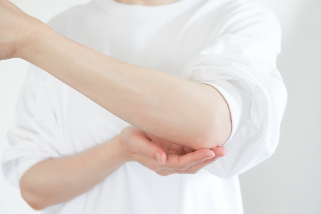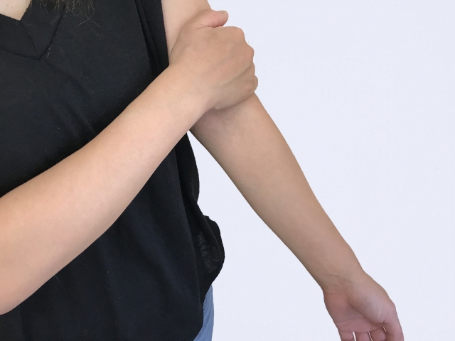 ・肘だけでなく、前腕(特に手の甲側)の筋肉が張る、だるい感じがあり、進行すると肩や首まで影響が出ることもある。